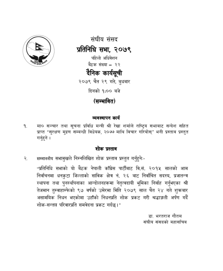 सभामुख देवराज घिमिरले शोक प्रस्ताव पनि प्रस्तुत गर्ने सम्भावित कार्यसूची रहेको संसद् सचिवालयले जनाएको छ।