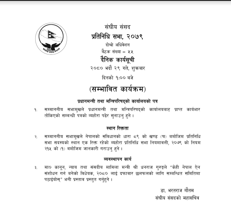कानुन, न्याय तथा संसदीय मामिला मन्त्री धनराज गुरुङले ‘केही नेपाल ऐन संसोधन गर्न बनेको बिद्येयक २०८० लाई दफाबार छलफलका लागि सबन्धित समितिमा पठाइयोस’ भन्ने प्रस्ताव गर्ने सम्भावित कार्यसुचीमा उल्लेख गरिएको छ ।