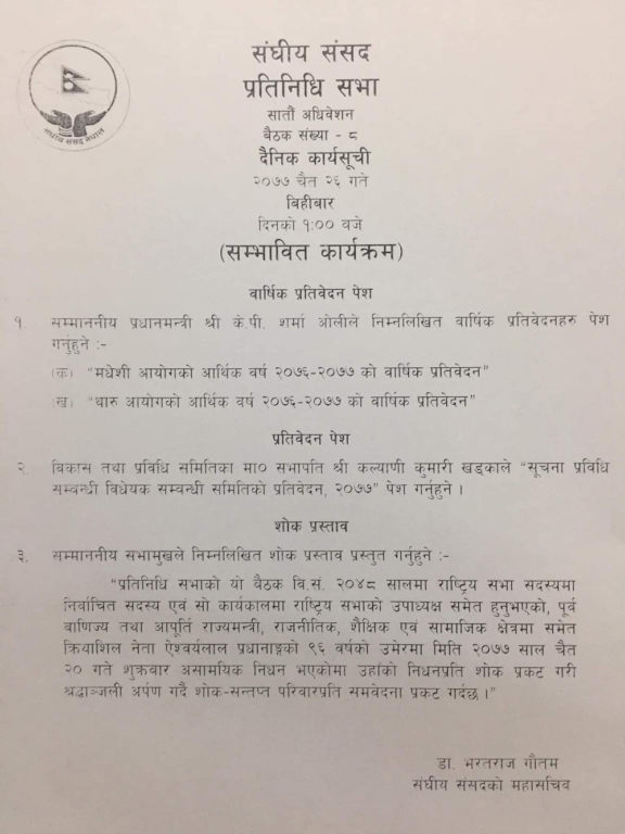 त्यसैगरी, सो बैठकमा राष्ट्रिय सभाका पूर्वसांसद तथा पूर्व वाणिज्य तथा आपूर्ति राज्यमन्त्री ऐश्वर्यलाल प्रधानांगको निधनमा श्रद्धाञ्जलि व्यक्त गरिनेछ ।
