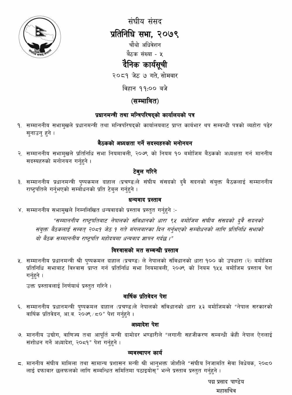 त्यस्तै, नेपाल सरकारको वार्षिक प्रतिवेदन तथा अध्यादेश पेश गर्ने कार्यसूची छ । आइतबारको बैठक गृहमन्त्री रवि लामिछानेले बोलेपछि कार्यसूचीमा प्रवेश नगरी स्थगित भएको थियो।