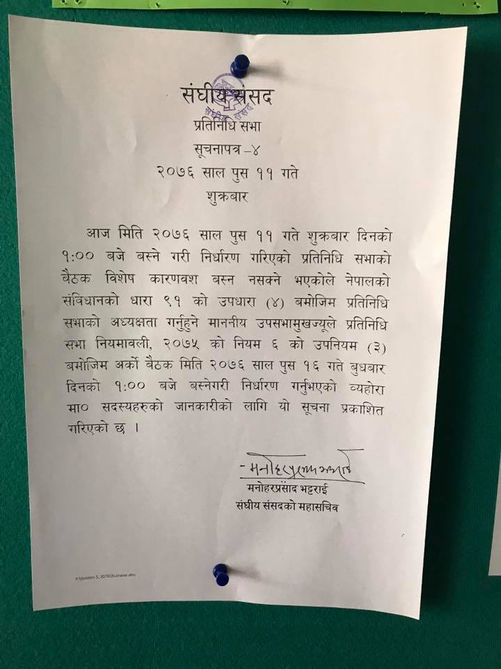 काठमाडौं – शुक्रबारको प्रतिनिधिसभाको बैठक स्थगित भएको छ । सत्तारुढ नेपाल कम्युनिस्ट पार्टी (नेकपा)ले सभामुखको उम्मेदवारमा सहमति जुटाउन नसक्दा आज १ बजेका लागि बोलाइएको बैठक सूचना टाँसेर ६ दिनका लागि स्थगित गरिएको हो ।