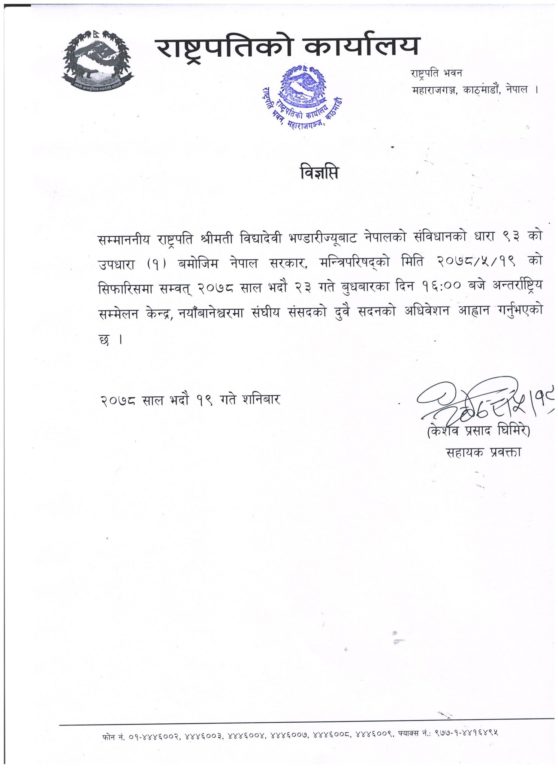 राष्ट्रपतिद्वारा भदौ २३ गते संसद् अधिवेशन आह्वान