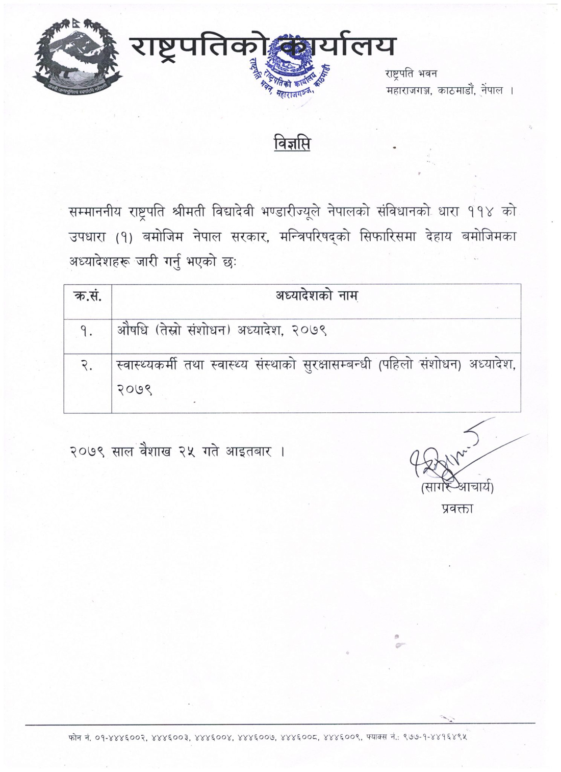 काठमाण्डु राष्ट्रपति विद्यादेवी भण्डारीले दुईवटा अध्यादेश जारी गरेकी छन् । राष्ट्रपति भण्डारीले औषधि (तेस्रो संशोधन) अध्यादेश, २०७९ स्वास्थ्यकर्मी तथा स्वास्थ्य संस्थाको सुरक्षासम्बन्धी (पहिलो संशोधन) अध्यादेश, २०७९ जारी गरेकी हुन् ।
