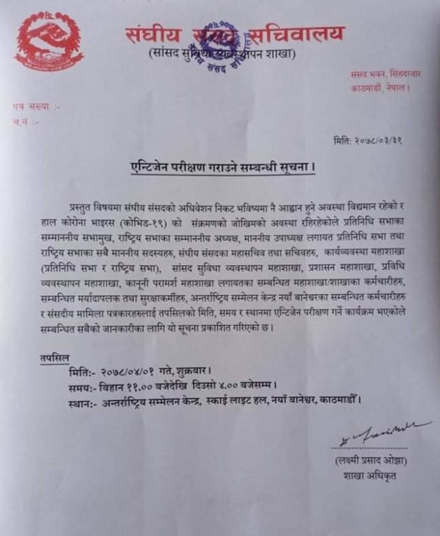 सचिवालयले आज एक सूचना जारी गर्दै सांसद, संसदका कर्मचारी तथा सचिवालयका कर्मचारी, संसदीय मामिलाका पत्रकारलगायतको एन्टीजेन विधिबाट कोरोना परीक्षण गर्न लागिएको जानकारी दिएको हो ।