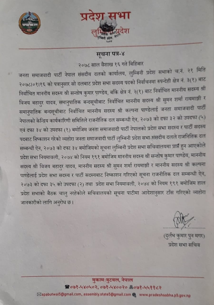 पदमुक्त हुनेहरुमा सन्तोष कुमार पाण्डे, विजय यादव, सुमन शर्मा रायमाझी र कल्पना पाण्डेय रहेका छन् । लुम्बिनी प्रदेशसभाले उनीहरुलाई पदमुक्त गरेको जानकारी दिएको हो ।