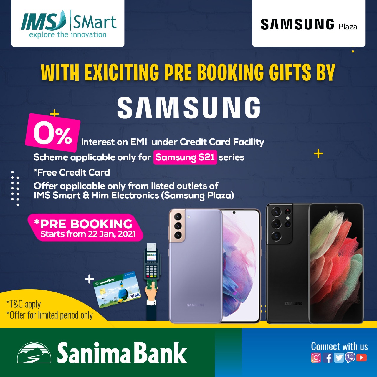 काठमाण्डु – सानिमा बैंकले सामसुङको एस २१ सिरिज खरिद गर्न निःशुल्क क्रेडिट कार्ड तथा शून्य प्रतिशत ब्याजदरमा मासिक किस्ताबन्दीको व्यवस्था गरेको छ ।