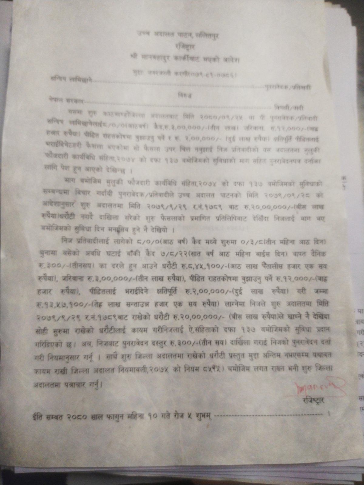 उच्च अदालतका रजिस्ट्रार मानबहादुर कार्कीले पुनरावेदन दर्ता गर्दै थुनामा नबसी पुनरावेदन गर्ने सुविधा हुने आदेश गरेका छन् ।