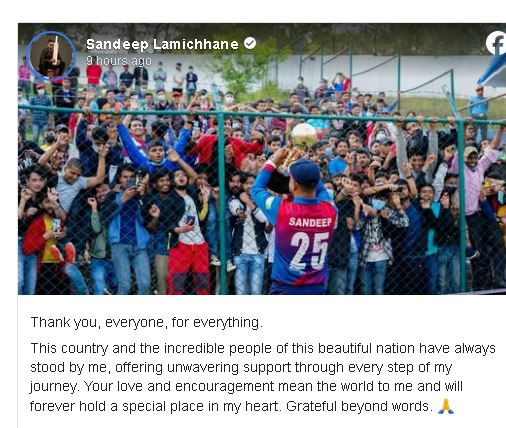 काठमाण्डु- नेपाली राष्ट्रिय टिमका पूर्वकप्तान सन्दीप लामिछानेले खेलजीवनबाट सन्यास लिने संकेत गरेका छन् । उनले आइतवार सामाजिक सञ्जालब फेसबुकमा आफ्ना समर्थकहरूप्रति कृतज्ञता जाहेर गर्दै यस्तो संकेत गरेका हुन् ।