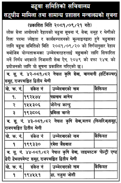 मन्त्रालयले नेपाल कृषि सेवा, बागवानी (हर्टिकल्चर) समूहतर्फ रिक्त उपसचिव पदमा ३ जना, मत्स्य (फिसरिज) समूहमा १ जना र लाइभस्टक पोल्ट्री एण्ड डेभलपमेण्ट समूहतर्फ १ जनालाई ज्येष्ठता र कार्यसम्पादनको मूल्यांकनद्वारा हुने बढुवाका लागि सिफारिस गर्ने निर्णय गरेको हो ।
