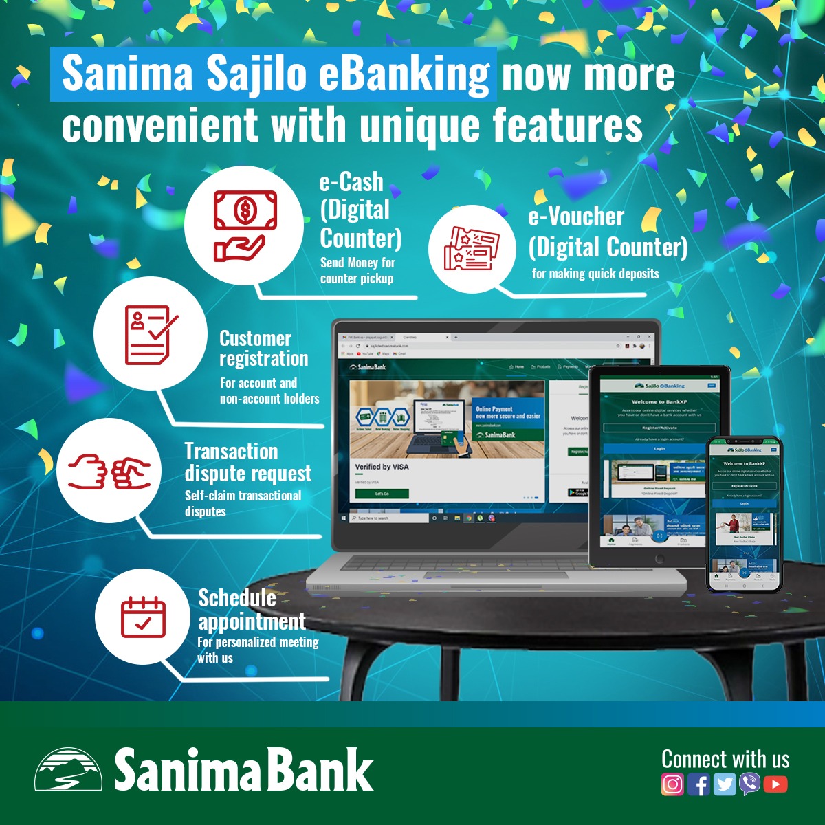 सानिमा बैंकको सम्पूर्ण डिजिटल बैंकिङ्ग सेवाहरु मोबाइल बैंकिङ्ग एप् वा वेब ब्राउजरमा चल्ने हुँदा मोबाइल फोन, ट्याब्लेट, ल्यापटप र कम्युटरबाट पनि चलाउन सकिने बैंकले जनाएको छ ।