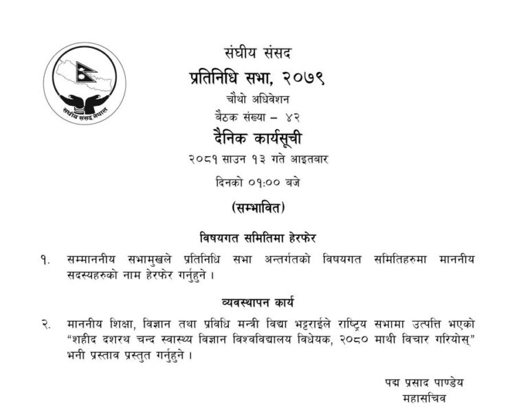 त्यस्तै, शिक्षा, विज्ञान तथा प्रविधिमन्त्री विद्या भट्टराईले राष्ट्रियसभामा उत्पत्ति भएको सहिद दशरथचन्द स्वास्थ्य विज्ञान विश्वविद्यालय विधेयक, २०८० माथि विचार गरियोस् भनी प्रस्ताव प्रस्तुत गर्ने सम्भावित कार्यसूची रहेको जनाइएको छ ।