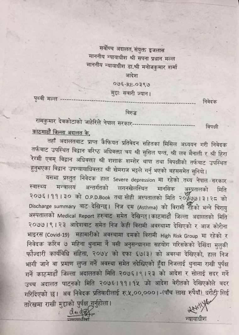 सर्वोच्च अदालतका न्यायाधीशद्वय सपना प्रधान मल्ल र मनोजकुमार शर्माको संयुक्त इजलासले उनी दम र डिप्रेसनका बिरामी रहेको र कोभिड १९ को उच्च जोखिममा रहेको बताउंदै ५ लाख धरौटीमा मुक्त गर्न फैसला सुनाएपछि त्यो निर्णयको आलोचना भएको थियो ।