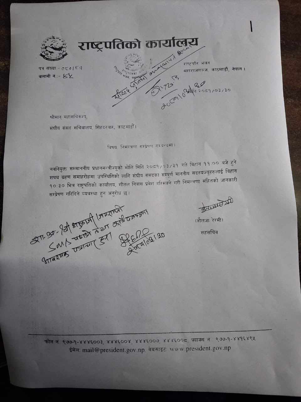 राष्ट्रपति कार्यालयले संसद सचिवालयलाई पत्राचार गर्दै सबै सांसदहरुलाईप्रधानमन्त्री ओलीको शपथ ग्रहण समारोहमा सहभागी हुन निमन्त्रणा गरेको हो ।