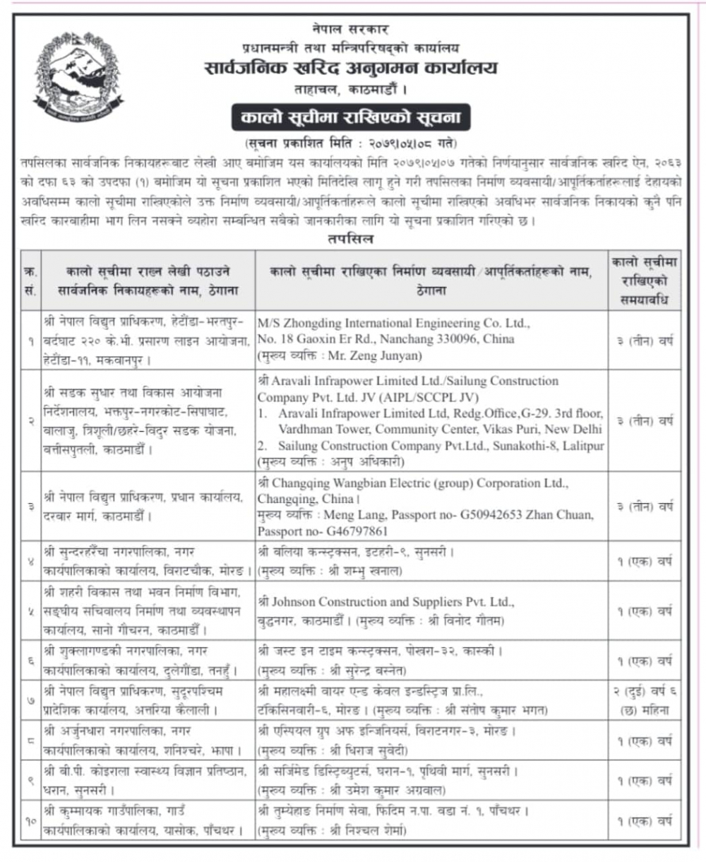 बुधबार सार्वजनिक खरिद अनुगमन कार्यालयले सूचना जारी गर्दै नेकपा माओवादी केन्द्रका अध्यक्ष प्रचण्डका घरबेटी शारदा प्रसाद अधिकारीको निर्माण कम्पनी शैलुङसहित १० वटा निर्माण कम्पनीलाई कालो सूचीमा राखेको जानकारी दिएको हो ।