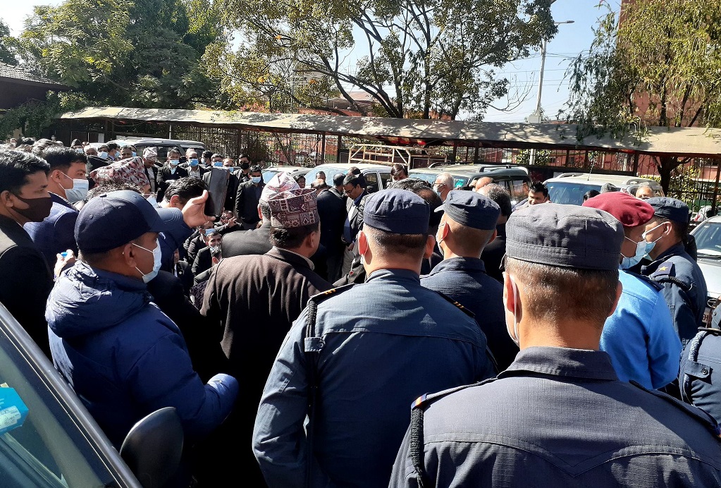 काठमाण्डु – सर्वोच्च अदालतमा आइतबार पनि कानुन व्यवसायी र प्रहरीबीच घम्साघम्सी भएको छ । प्रधानन्यायाधीश चोलेन्द्रशमशेर जबराको राजीनामा माग गर्दै धर्नामा बसेको कानुन व्यवसायी र प्रहरीबीच घम्साघम्सी भएको हो । हातमा कालो पट्टी बाँधेर प्रधानन्यायाधीश जबराको राजीनामा माग गर्दै विरोध प्रदर्शन गरिरहेका कानुन व्यवसायीलाई प्रहरीले रोक्न खोज्दा धकेलाधकेल भएको जनाइएको छ ।