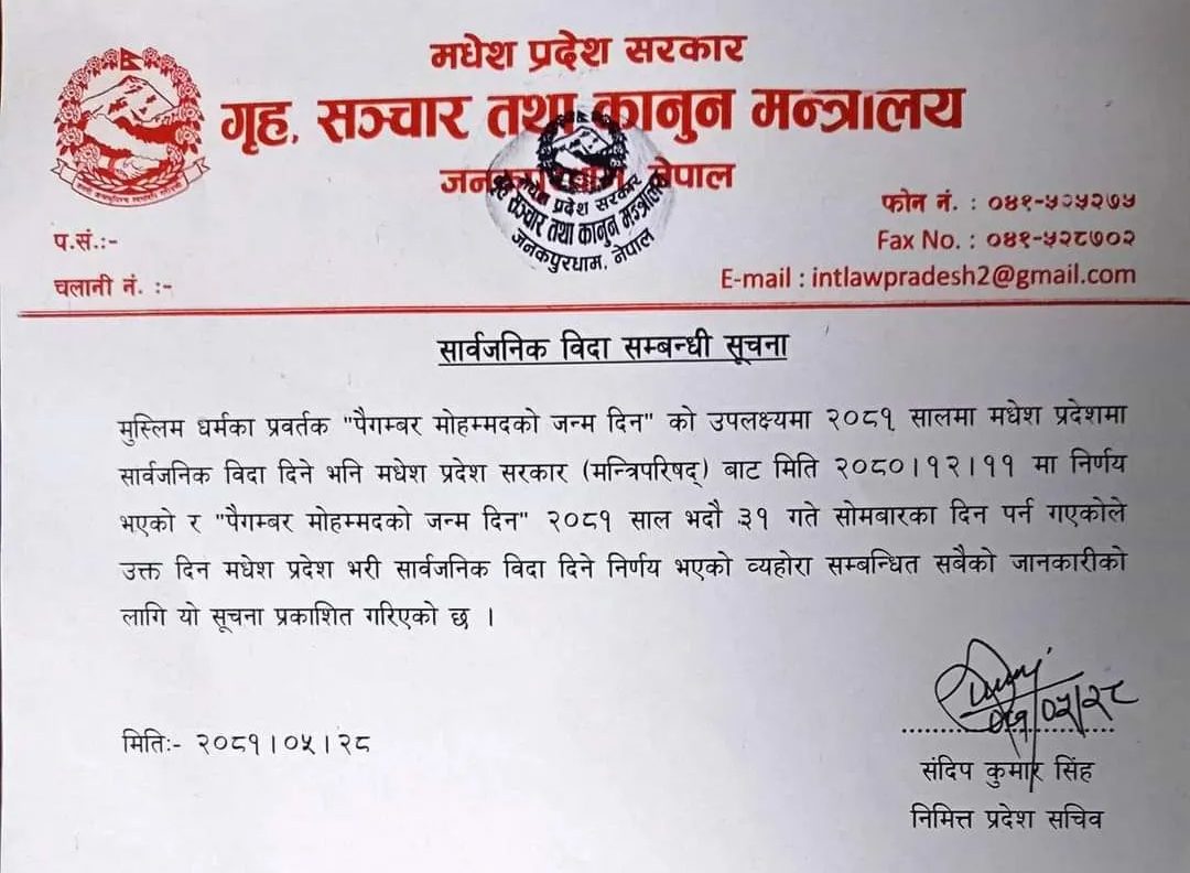 गृह, सञ्चार तथा कानून मन्त्रालयले आज एक सूचना जारी गर्दै पैगम्बर मोहम्मदको जन्मदिनको अवसरमा सार्वजनिक बिदा दिने निर्णय भएको जानकारी गराएको हो ।