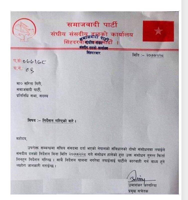 काठमाडौं – सांसद सरिता गिरीलाई समाजवादी पार्टीले संविधान संशोधन विधेयकमाथि दर्ता गरेको संशोधन प्रस्ताव फिर्ता लिन निर्देशन दिएको छ । उनले आफ्नो प्रस्ताव फिर्ता नलिए कारवाही गर्ने पार्टीले निर्णय गरेको छ ।