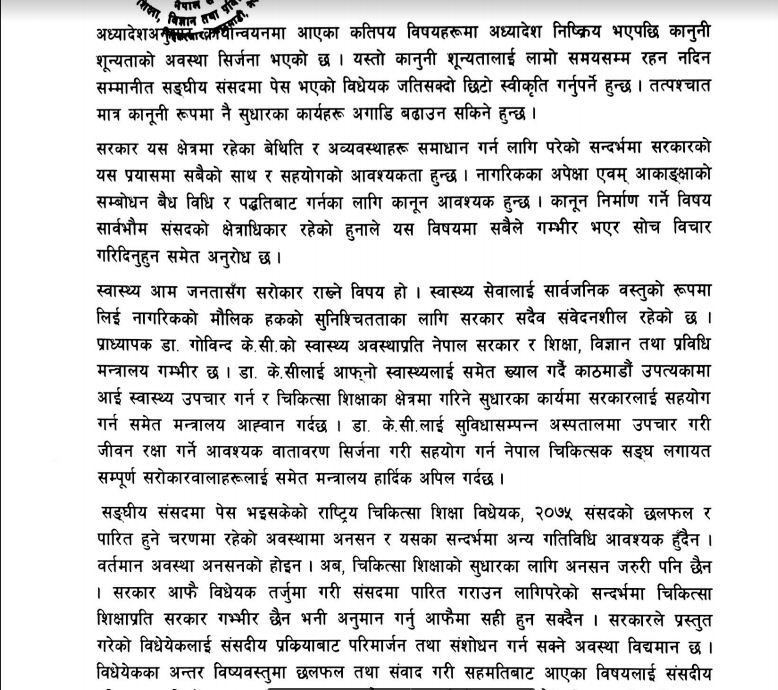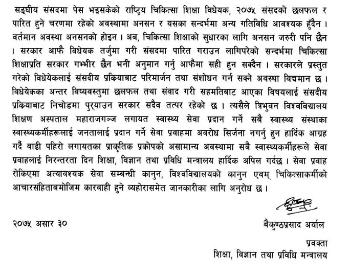 मन्त्रालयले विचाराधीन विधेयकलाई आवश्यक छलफल गरी निचोडमा र्पुयाउन सरकार तयार रहेको भन्दै यस्तो अवस्थामा अनशन आवश्यक नरहेको विज्ञप्तिमा उल्लेख गरेको छ ।