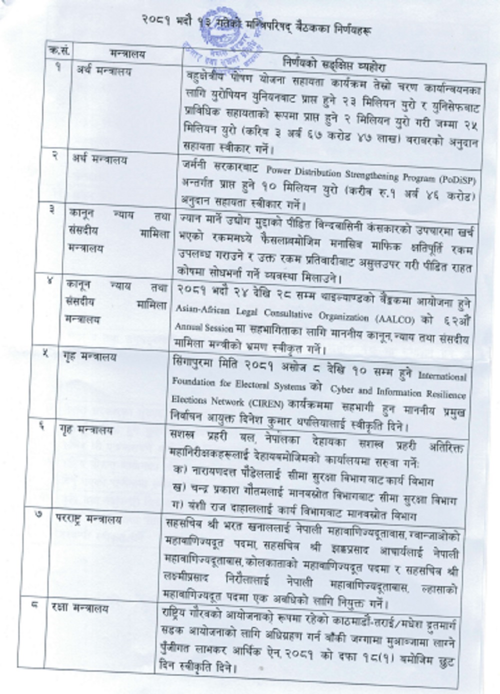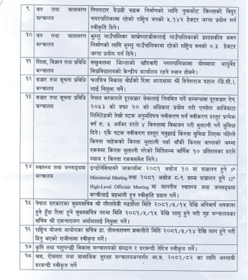 काठमाण्डु–मन्त्रिपरिषद्को गत विहिबार बसेको बैठकका निर्णय सार्बजनिक भएका छन् ।