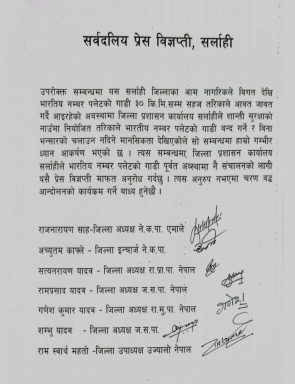 आईतबार जारी गरिएको सर्वदलीय प्रेस विज्ञप्तिमा विगतदेखि भारतीय नम्बर प्लेटका सवारीसाधनहरू करिब ३० किलोमिटरसम्म सहज रूपमा आवतजावत गर्दै आएको उल्लेख गर्दै हाल जिल्ला प्रशासन कार्यालय सर्लाहीले शान्ति सुरक्षाको नाममा ती सवारीसाधनहरू रोकेर बिना भन्सार सञ्चालनमा रोक लगाउने मानसिकता देखाएको आरोप लगाइएको छ ।