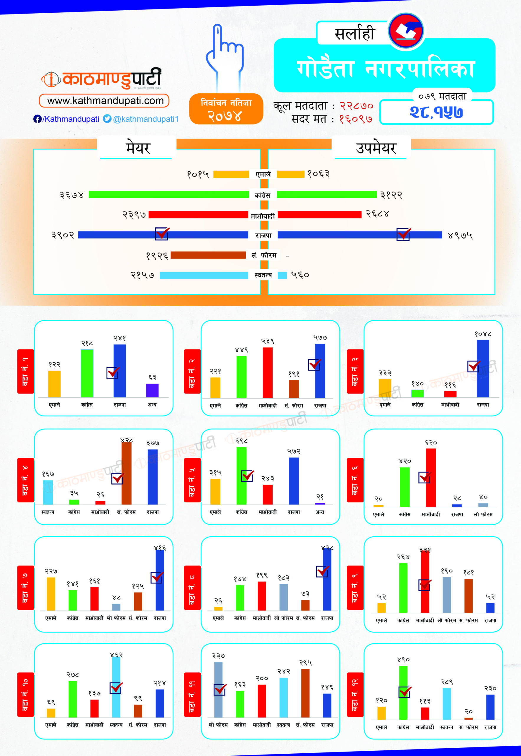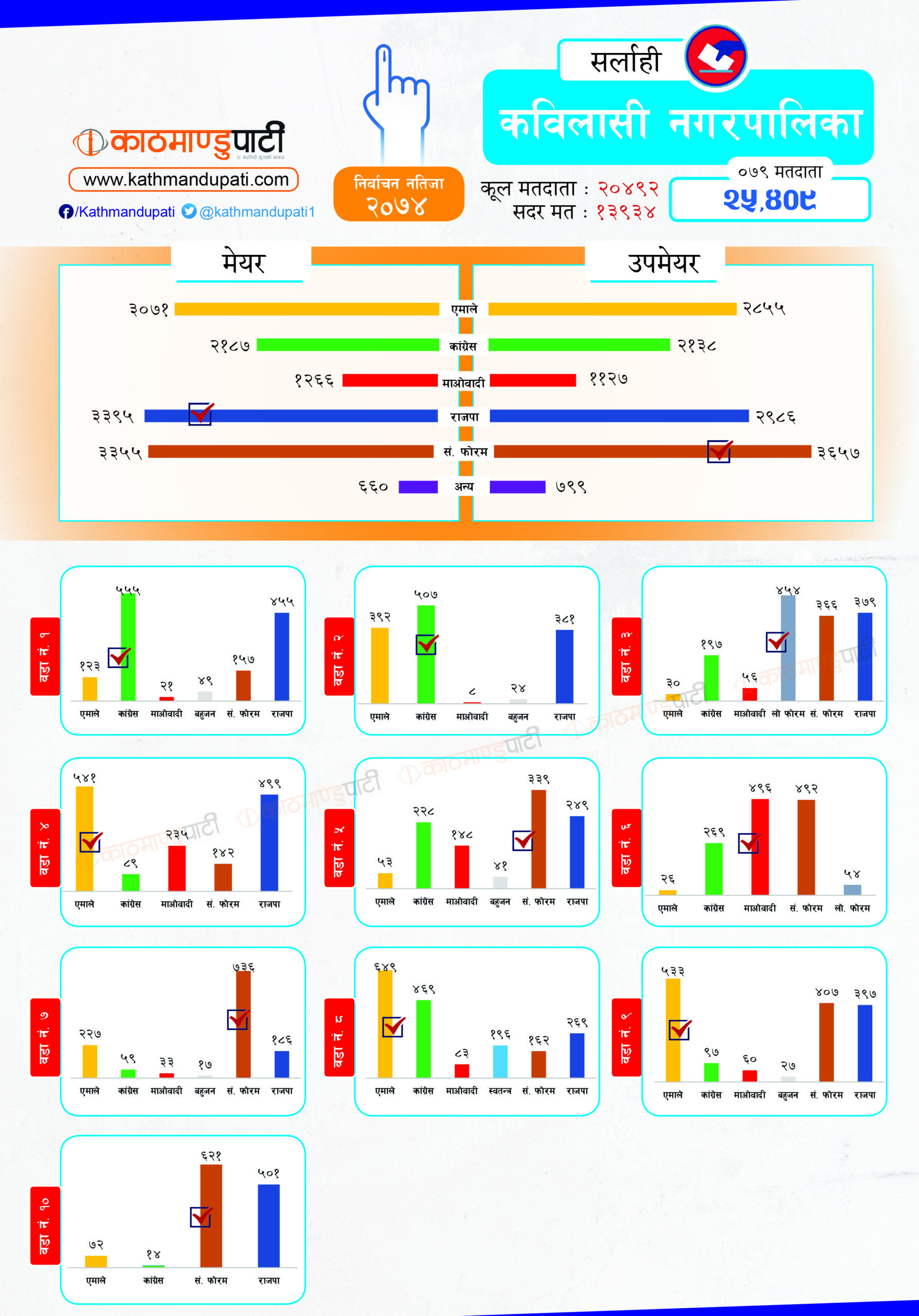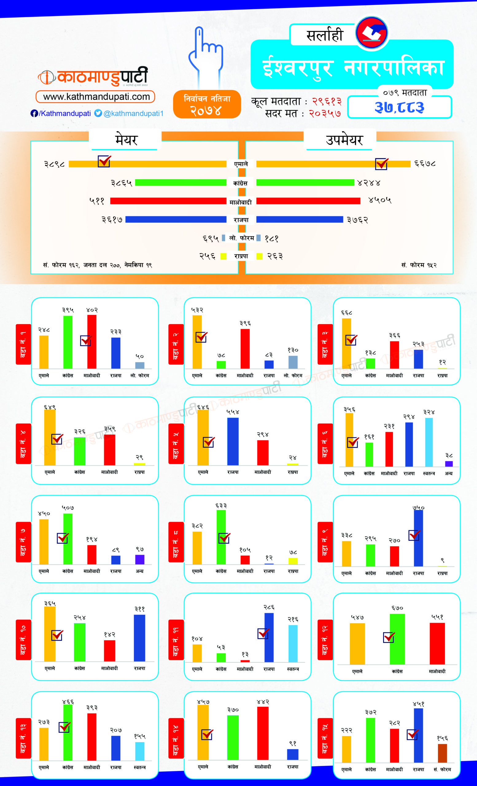 ईश्वरपुर नगरपालिकामा एमालेका मनोजकुमार देवकोटा, हरिवनमा गणेश प्रसाईं फेरि मेयरमा उठेका छन् । बागमती नगरपालिकामा माओवादीका भरतकुमार थापा पनि दोहोरिने दौडमा छन् । कविलासी नगरपालिकामा तत्कालीन राजपाबाट जितेका मेयर कौशलकिशोर राय एमाले प्रवेश गरेर फेरि सोही पदमै उठेका छन् । यसअघि यहाँ राजपा र संघीय फोरमबीच प्रतिस्पर्धा भएको थियो ।
