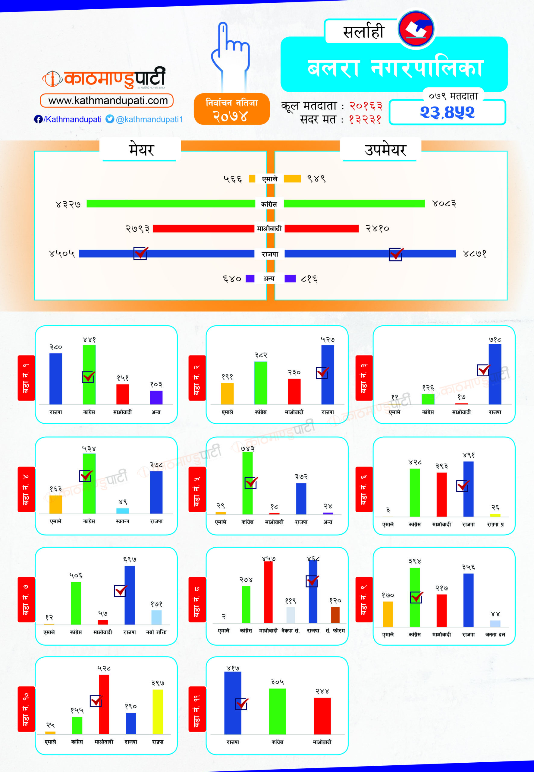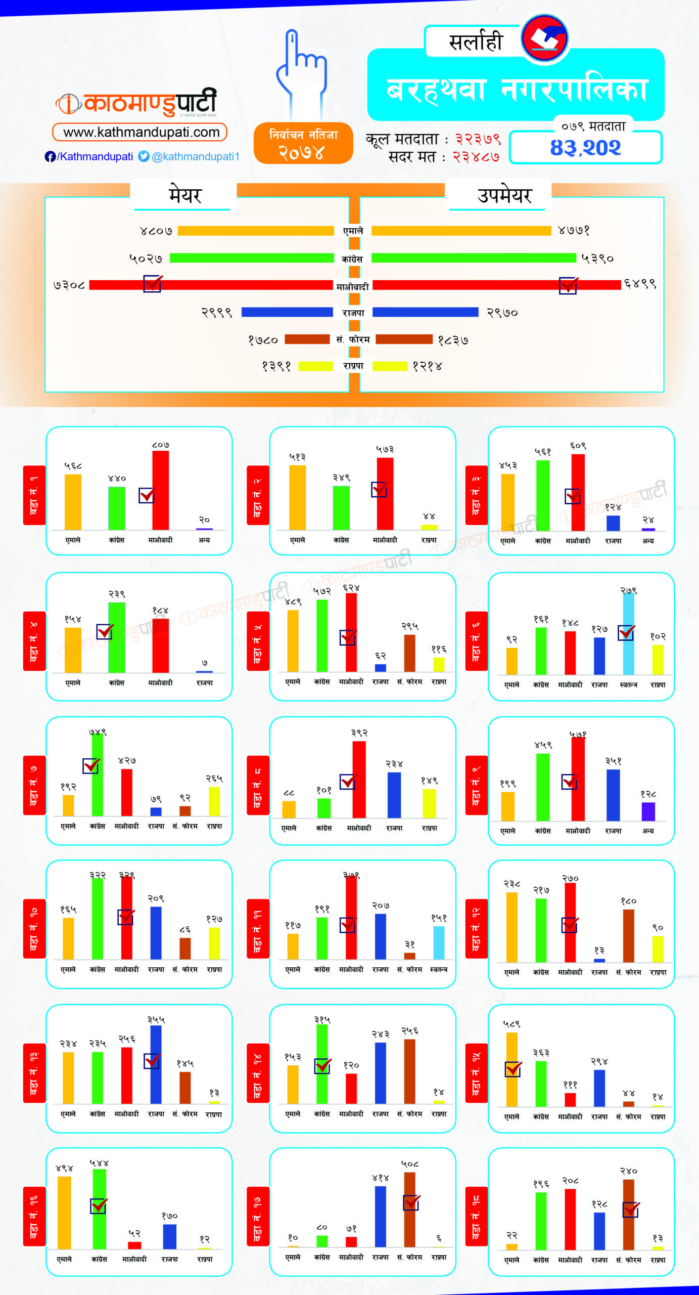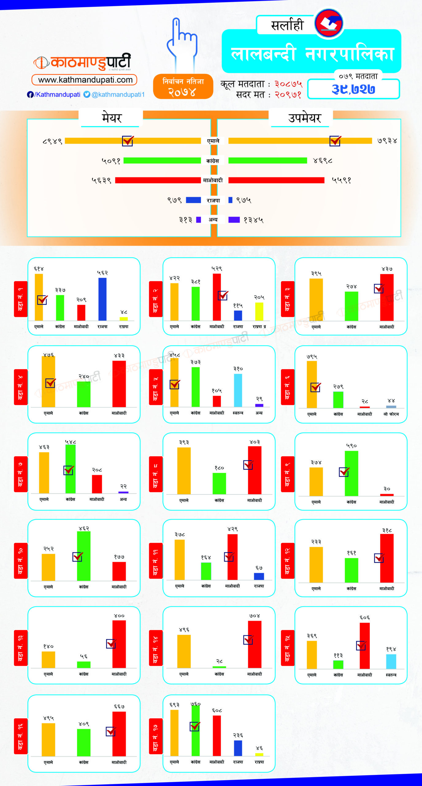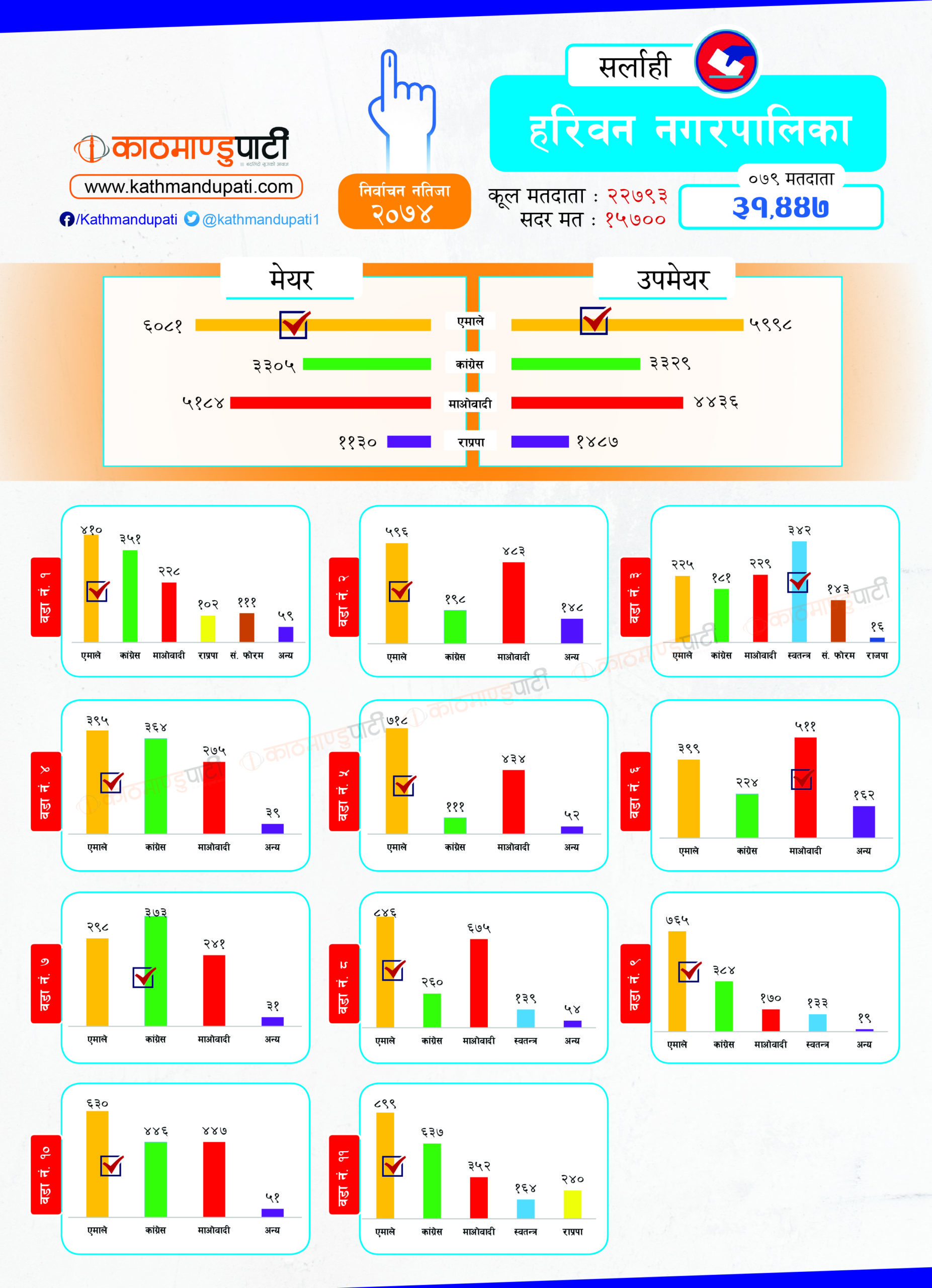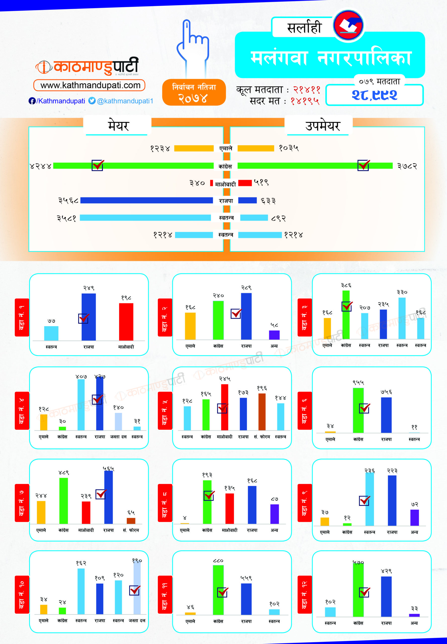 सदरमुकाम मलंगवामा कांग्रेसबाट जितेका मेयर निरसल साह जसपामा प्रवेश गरी फेरि सोही पदमा उठेका छन् । कांग्रेसले टिकट नदिएपछि उनले पार्टी फेरेका हुन् । अघिल्लोपटक राजपाबाट जितेका अधिकांशले यसपटक लोसपाबाट उम्मेदवारी दिएका छन् । सर्लाहीमा एमाले विभाजनको असर पनि बढी छ । हरिपुर नगरपालिकामा एमालेबाट निर्वाचित मेयर जमिरुद्दिन मन्सुर यसपटक एकीकृत समाजवादी पार्टीबाट लडेका छन् ।