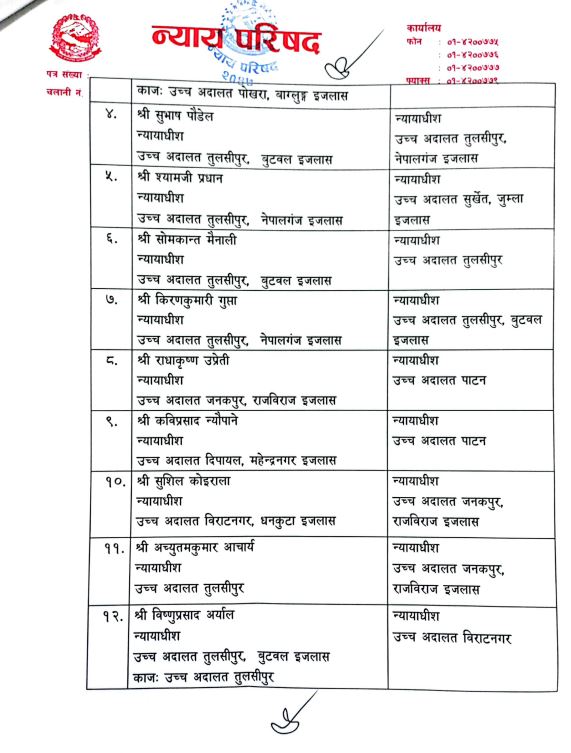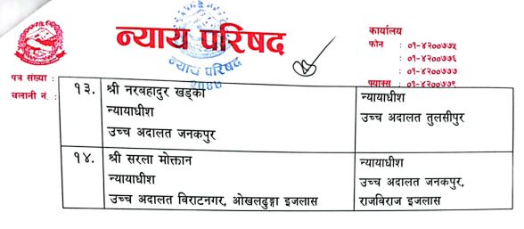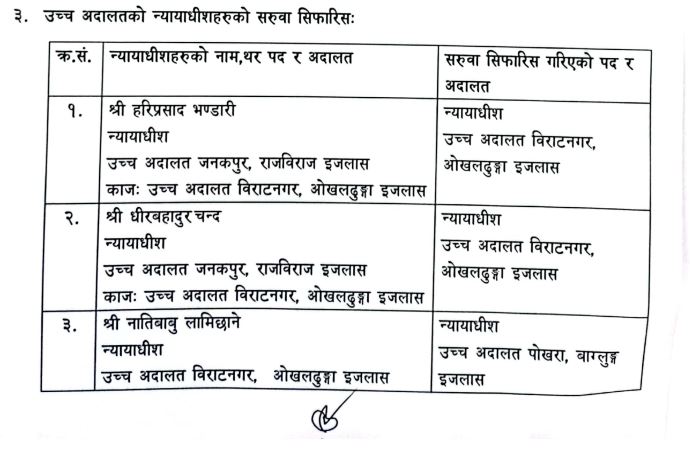 उच्च अदालत जनकपुर राजविराज इजलासका न्यायाधीश हरिप्रसाद भण्डारीलाई उच्च अदालत विराटनगर ओखलढुंगा इजलास, उच्च अदालत जनकपुर राजविराज इजलासका न्यायाधीश धीरबहादुर चन्दलाई उच्च अदालत विराटनगर ओखलढुंगा इजलासमा सरुवा गर्न सिफारिस गरिएको छ ।