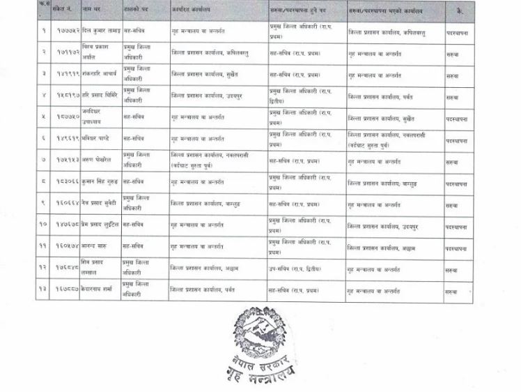 सूची अनुसार कपिलवस्तुका प्रमुख जिल्ला अधिकारी विश्वराज अर्याल, सुर्खेतका शंकरहरि आचार्य गृह मन्त्रालयमा तानिएका छन् ।