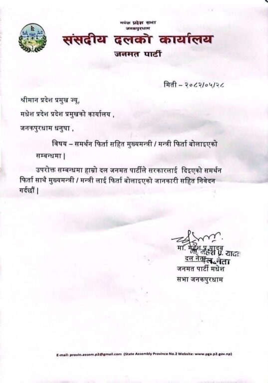 शनिबार संसदीय दलका नेता महेशप्रसाद यादवले मधेश प्रदेश प्रमुखलाई पत्र लेख्दै मुख्यमन्त्रीलाई फिर्ता बोलाएर सरकारलाई दिएको समर्थन फिर्ता लिएका छन् ।
