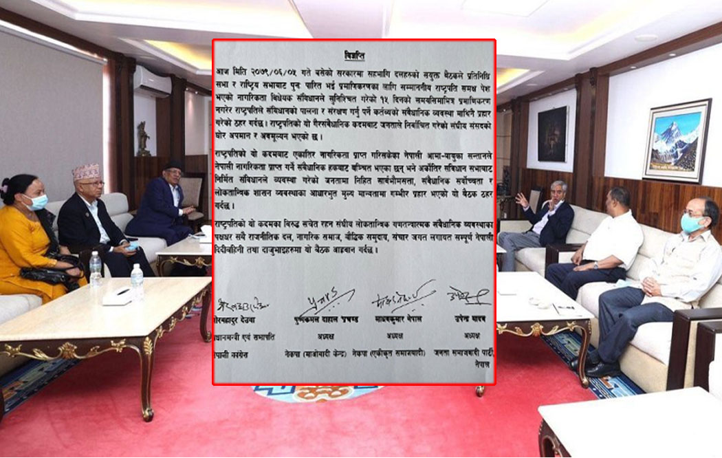 काठमाण्डु – सरकारमा सहभागी दलहरूको बुधबार बसेको संयुक्त बैठकले प्रतिनिधि सभा र राष्ट्रिय सभाबाट पुनः पारित भई प्रमाणिकरणका लागि राष्ट्रपति समक्ष पेश भएको नागरिकता विधेयक प्रमाणिकरण नगरेर राष्ट्रपतिले संवैधानिक व्यवस्थामाथि नै प्रहार गरेको ठहर गरेको निश्कर्ष निकालेको छ । संविधानले सुनिश्चित गरेको १५ दिनको समयसिमा हिजो बुधबार सकिएको हो ।