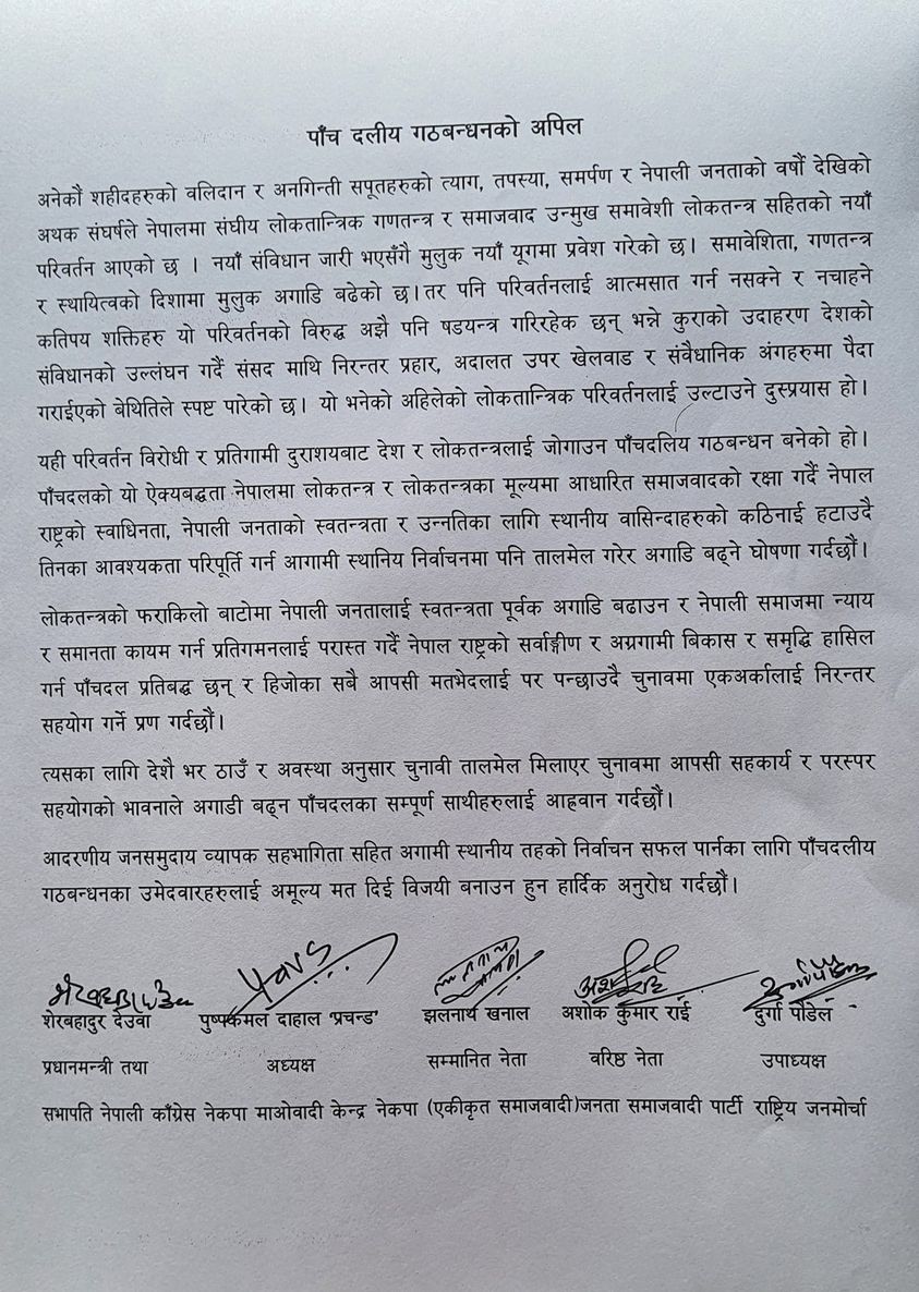 काठमाण्डु – पाँच दलीय सत्ता गठबन्धनले सहकार्य र सहयोगको भावनाले अघि बढ्न आह्वान गरेको छ । सोमबार बालुवाटारमा बसेको बैठकपछि संयुक्त अपिल जारी गर्दै गठबनधनका शीर्ष नेताहरुले देशभर ठाउँ र अवस्थाअनुसार चुनावी तालमेल मिलाएर आपसी सहकार्य र सहयोगको भावनाले अघि बढ्न आह्वान गरेका हुन् ।