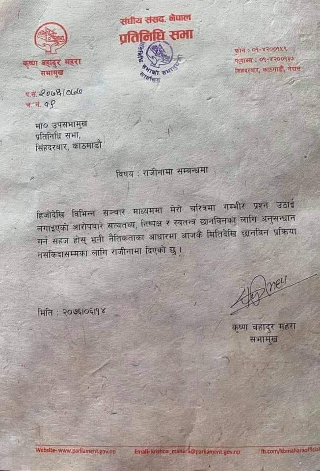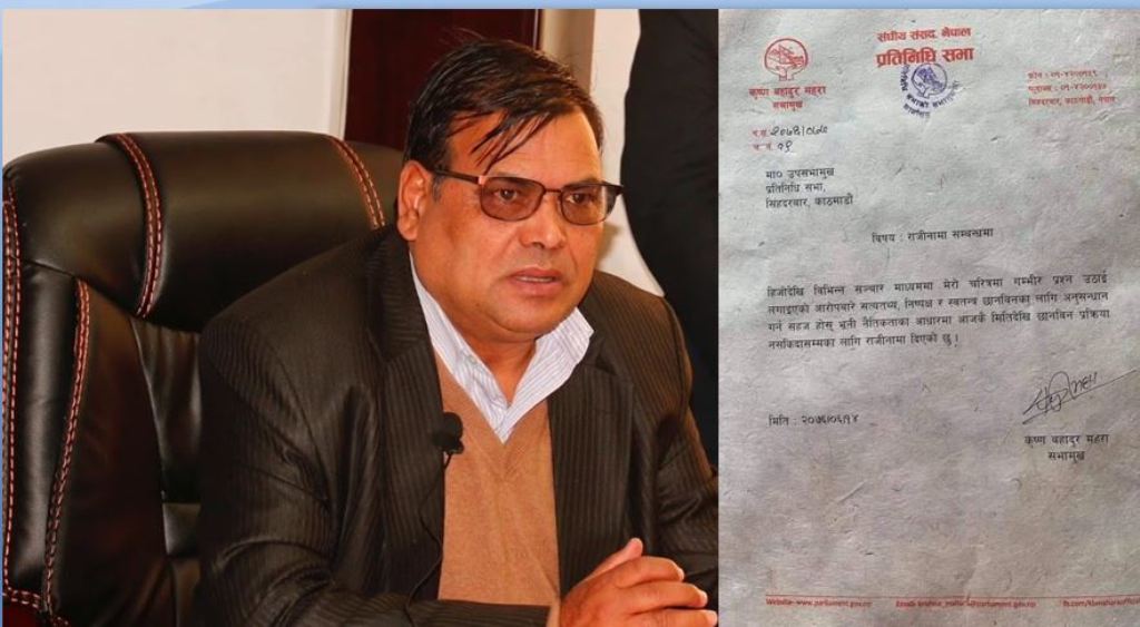 काठमाडौं – प्रतिनिधिसभाका सभामुख कृष्णबहादुर महरामाथि संसद सचिवालयकी महिला कर्मचारीले यौन दुर्व्यवहार गरेको आरोप लगाएपछि सभामुख महराले आफ्नो पदबाट राजीनामा दिएका छन् ।
