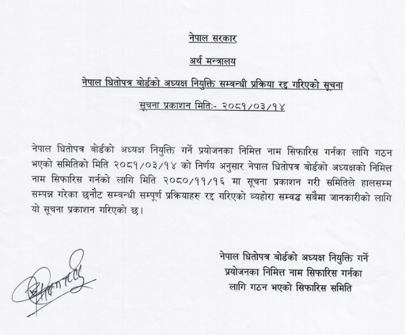अर्थ मन्त्रालयले राष्ट्रिय योजना आयोगका उपाध्यक्ष डा. मिन बहादुर श्रेष्ठ संयोजकत्वमा बोर्ड अध्यक्ष नियुक्तिका लागि सिफारिस गठन गरेको समितिले शुक्रबार सूचना जारी गरेर प्रक्रिया रद्द गरिएको जानकारी दिएको हो ।