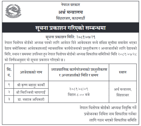 अर्थ मन्त्रालयले छनोट सूचीमा परेका कृष्णबहादुर कार्की, चिरञ्जीवी चापागाईँ र डा.नवराज अधिकारीलाई अन्तर्वार्ताका लागि बोलाएको हो । अन्तर्वार्ता मंसिर ९ गते बिहान ८ बजे हुनेछ ।