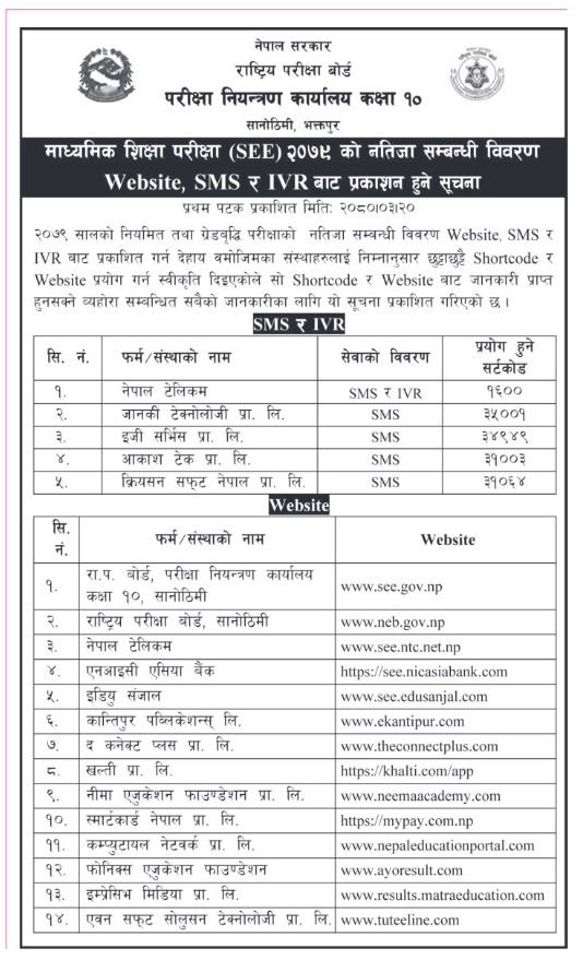काठमाण्डु- राष्ट्रिय परीक्षा बोर्डले माध्यमिक शिक्षा परीक्षा (एसइई) को नतिजा यही शुक्रबारभित्रै सार्वजनिक गर्ने भएको छ । बोर्ड अध्यक्ष महाश्रम शर्माले शुक्रबारभित्रै एसइईको नतिजा सार्वजनिक गर्ने गरी तयारी जानकारी दिएका हुन् ।