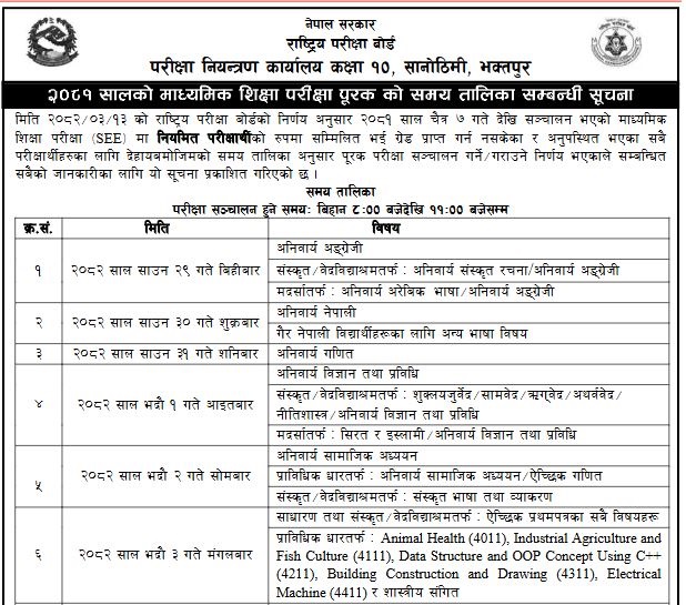 परीक्षा साउन २९ देखि भदौ ६ गतेसम्म बिहान ८ बजेदेखि ११ बजेसम्म हुने छ । राष्ट्रिय परीक्षा बोर्डका अनुसार परीक्षार्थीले पुरानै प्रवेशपत्रबाट परीक्षा दिन पाउने छन् ।