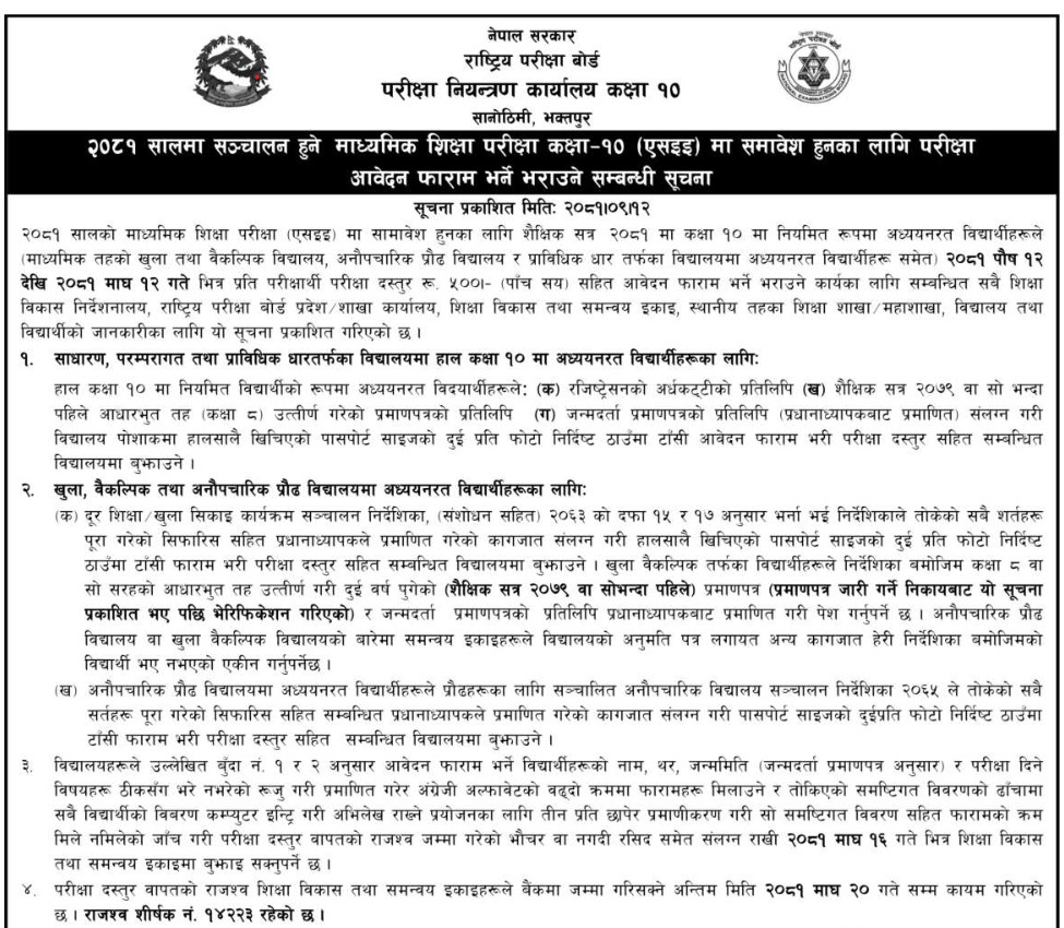 सबै शिक्षा विकास निर्देशनालय, बोर्डका प्रदेश र शाखा कार्यालय, शिक्षा विकास तथा समन्वय इकाईं, स्थानीय तहका शिक्षा शाखा, महाशाखा, विद्यालय तथा विद्यार्थीलाईसमेत समयमै एसईई परीक्षाको फारम भर्न कार्यालयले आग्रह गरेको हो । एसईईको फारम दस्तुर कार्यालयले पाँचसय रुपैयाँ तोकेको छ ।