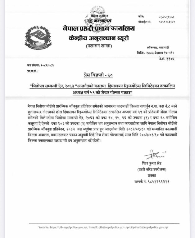 काठमाण्डु – नेपाल प्रहरीको केन्द्रीय अनुसन्धान ब्यूरो (सीआईबी) ले हिमालयन रिइन्सुरेन्स लिमिटेडका तत्कालीन अध्यक्ष शेखर गोल्छालाई पक्राउ गरेको छ ।