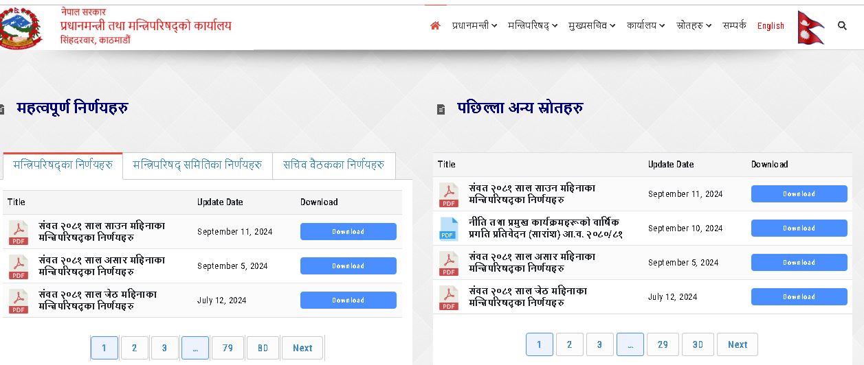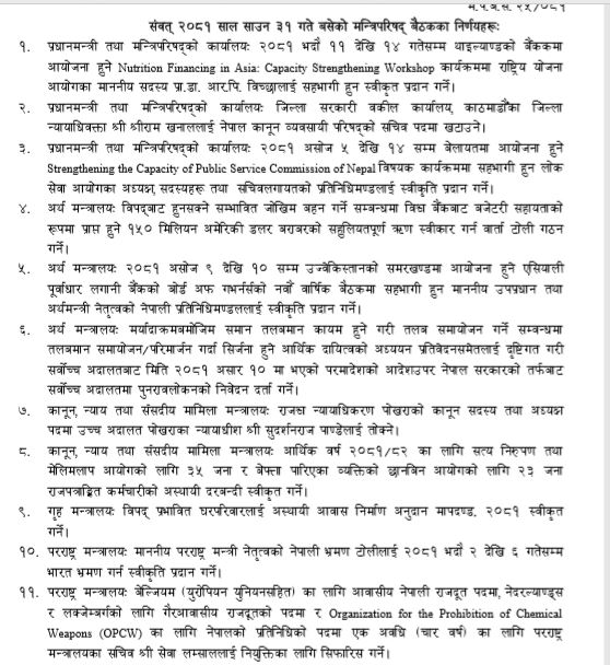 तर, प्रधानमन्त्री तथा मन्त्रिपरिषद् कार्यालयको आधिकारिक वेभ पोर्टलमा साउन महिनाभरका मन्त्रिपरिषद् बैठकले गरेका निर्णयहरू २६ भदौ (११ सेप्टेम्बर २०२४)मा सार्वजनिक गरिएको मिति देखिन्छ ।