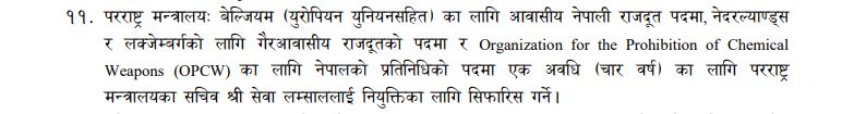औपचारिक रूपमा सरकारका प्रवक्ताले सार्वजनिक नगरेको परराष्ट्रसचिव लम्साललाई राजदूत सिफारिस गर्ने निर्णयमा लेखिएको छ, ‘बेल्जियम (युरोपियन युनियनसहित)का लागि आवासीय नेपाली राजदूत पदमा, नेदरल्यान्ड्स र लम्जेम्बर्गका लागि गैरआवासीय राजदूतको पदमा र रासायनिक हतियार निषेधका लागि संगठन (ओपीसीडब्लू) का लागि नेपालको प्रतिनिधिको पदमा एक अवधि (चार वर्ष) का लागि परराष्ट्र मन्त्रालयका सचिव सेवा लम्साललाई नियुक्तिका लागि सिफारिस गर्ने ।’