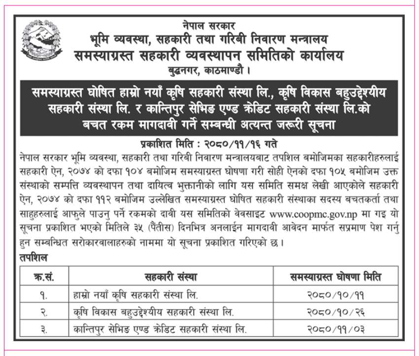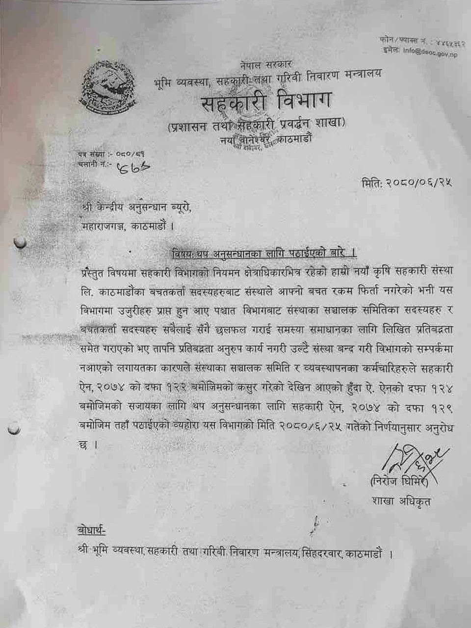 निक्षेपकर्ताको ४ करोड रकम फिर्ता नगरेपछि सहकारी विभागको सिफारिसमा गत माघ १२ गते सरकारले सहकारीलाई समस्याग्रस्त घोषणा गरेको हो । सहकारीमाथि नेपाल प्रहरीको केन्द्रीय अनुसन्धान ब्युरो (सीआईबी) ले अनुसन्धान गरिरहेको छ ।
