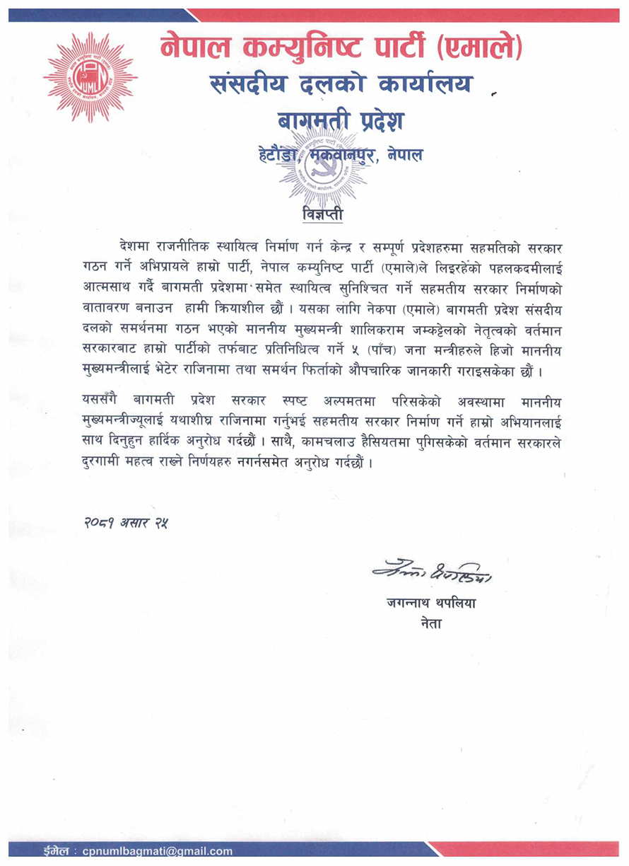 थपलियाले विज्ञप्तिमा लेखेका छन्, ‘देशमा राजनीतिक स्थायित्व निर्माण गर्न केन्द्र र सम्पूर्ण प्रदेशहरुमा सहमतिको सरकार गठन गर्ने अभिप्रायले हाम्रो पार्टी, नेपाल कम्युनिष्ट पार्टी (एमाले) ले लिइरहेको पहलकदमीलाई आत्मसाथ गर्दै बागमती प्रदेशमा समेत स्थायित्व सुनिश्चित गर्ने सहमतीय सरकार निर्माणको वातावरण बनाउन हामी क्रियाशील छौं । यसका लागि नेकपा (एमाले) बागमती प्रदेश संसदीय दलको समर्थनमा गठन भएको माननीय मुख्यमन्त्री शालिकराम जम्कट्टेलको नेतृत्वको वर्तमान सरकारबाट हाम्रो पार्टीको तर्फबाट प्रतिनिधित्व गर्ने ५ मन्त्रीहरुले हिजो माननीय मुख्यमन्त्रीलाई भेटेर राजीनामा तथा समर्थन फिर्ताको औपचारिक जानकारी गराइसकेका छौं ।’