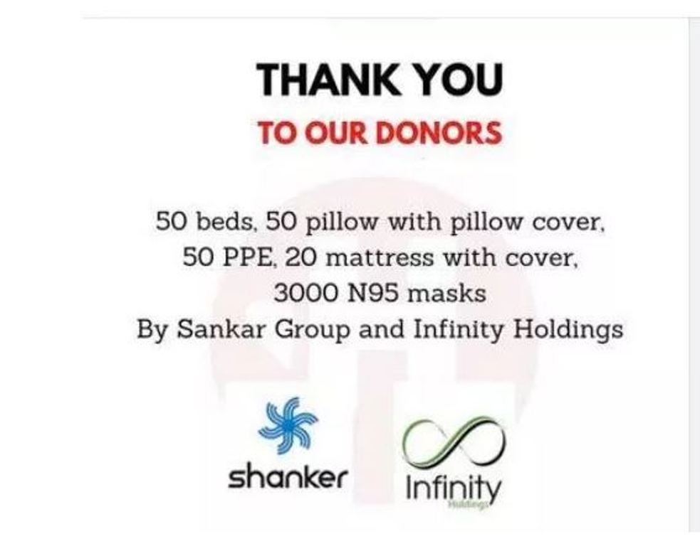 शंकर र इन्फिनिटीले काठमाडौंको वीर र सशस्त्र प्रहरी बल अस्पताल, रुपन्देही र सेती प्रादेशिक अस्पतालका लागि आवश्यक सहयोग अग्रंपक्तिमा खटिएका दुई समाजिक संस्था मार्फत केही सामाग्री हस्तानान्तरण गरिसकेका छन् भने केही सामाग्री एक दुई दिनमै हस्तानान्तण गर्ने तयारी गरेका छन् ।