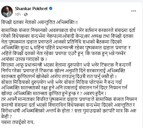 बिहीबार बसेको संसद् बैठकमा सामाजिक सञ्जाल विधेयकबारे अध्यक्ष प्रचण्डले दिएको अभिव्यक्ति सुन्दा आफूलाई ६ महिना पहिले प्रधानमन्त्री रहेका दाहाल र अहिलेका प्रतिपक्षी नेता दाहाल एउटै हुन् कि फरक भन्नेमा गम्भीर आशंका उत्पन्न भएको महासचिव पोखरेलले टिप्प्णी गरेका छन् ।