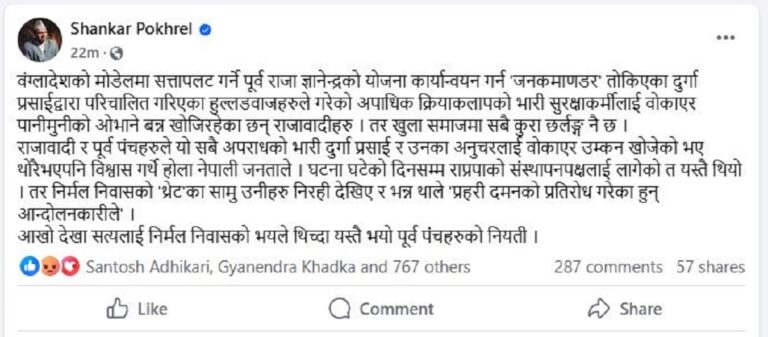 ‘बंगलादेशको मोडेलमा सत्तापलट गर्ने पूर्वराजा ज्ञानेन्द्रको योजना कार्यान्वयन गर्न ‘जनकमाण्डर’ तोकिएका दुर्गा प्रसाईद्वारा परिचालित हुल्लडवाजहरुले गरेको अपाधिक क्रियाकलापको भारी सुरक्षाकर्मीलाई वोकाएर पानीमुनीको ओभाने बन्न खोजिरहेका छन् राजावादीहरु,’ पोखरेलले लेखेका छन्, ‘तर खुला समाजमा सबै कुरा छर्लङ्ग नै छ ।’