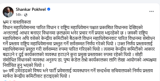 पोखरेलका अनुसार २०७८ भदौमा गोदावरीमा भएको पहिलो विधान महाधिवेशनमा पारित विधानलाई २०७८ मंसिरमा चितवनमा भएको १० औं राष्ट्रिय महाधिवेशनले ससोधन गरेको हो। ‘मंसिर ८ गते मध्यरातमा सौराहामा बसेको केन्द्रीय कमिटी बैठकले विधानमा रहेको दुई कार्यकालको प्रावधान हटाउने र केन्द्रीय कमिटीको आकार बढाउने निर्णय गरेको छ’, पोखरेलले लेखेका छन्।