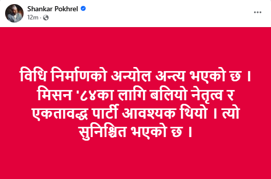 ‘विधि निर्माणको अन्योल अन्त्य भएको छ। मिसन ८४ का लागि बलियो नेतृत्व र एकताबद्ध पार्टी आवश्यक थियो। त्यो सुनिश्चित भएको छ’, उनले लेखेका छन्