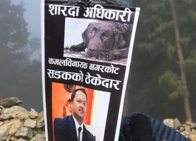 वर्षौदेखि काम हुँदै आए पनि अझै काम नसकेको भन्दै नगरकोट सडकखण्ड रोडका पोलपोलमा माथि जनावरको र तल ठेकेदार शारदाप्रसाद अधिकारीको फोटो टाँसेर विरोध जनाएका हुन् ।