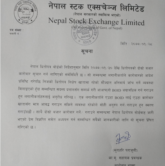 नेप्सेका प्रवक्ता मुराहरी पराजुलीले आइतबार विज्ञप्ति जारी गर्दै सम्बन्धित सदस्य दलालसंग सम्पर्क गरी सोही अनुसार आफ्नोे हितग्राही खाता अद्यावधिक गराउन आग्रह गरेका छन्। विज्ञप्तिमा दोस्रो बजारमा कारोबार गर्ने,गराउने सम्बन्धमा नेपाल धितोपत्र बोर्डबाट जारी गरेको विज्ञप्तिको समेत अध्ययन गर्न आग्रह गरिएको छ।