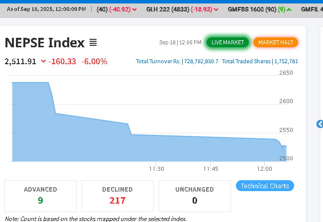 १२ः६ मा ६ प्रतिशतले सर्किट ब्रेक गर्दै नेप्से २५११ अंकमा झरेको छ । अथात् बजार १६० अंकले झरेको छ । यस अवधिमा १७ लाख कित्ता सेयर किनबेच भएको छ भने ७२ करोडको कारोबार भएको छ ।